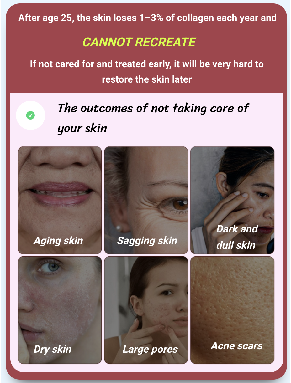As you're getting older, the production of Collagen and Hyaluronic Acid, Ceramides, starts to decrease, and there is a more dramatic decline by your 30’s. Your skin begins to age and experience wrinkles, dryness, uneven skin tone, and loss of firmness.