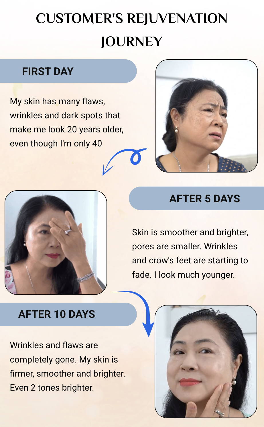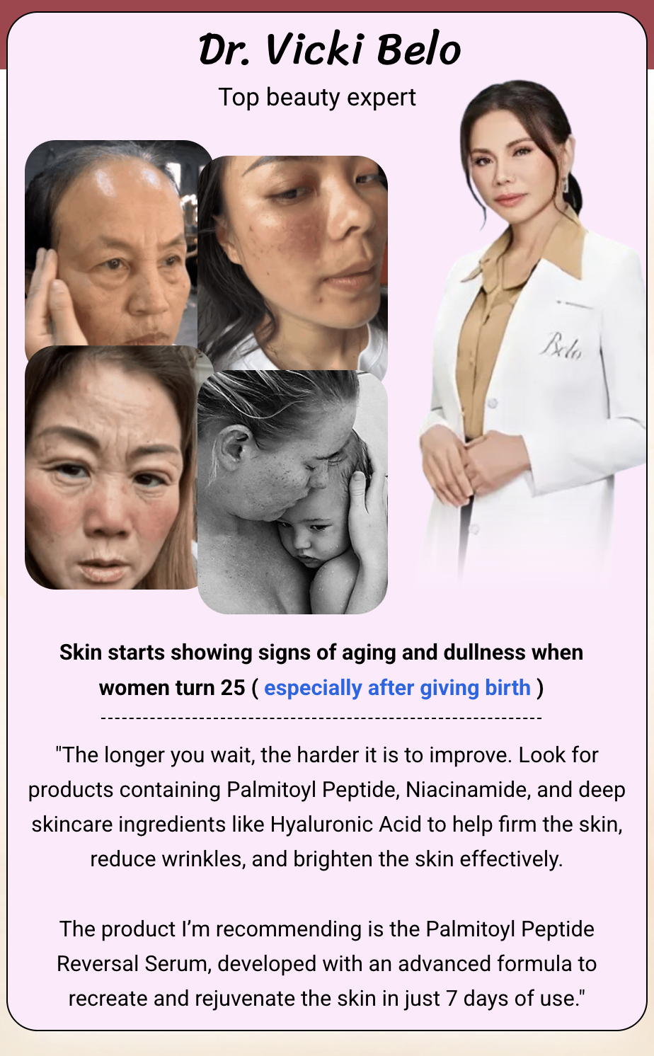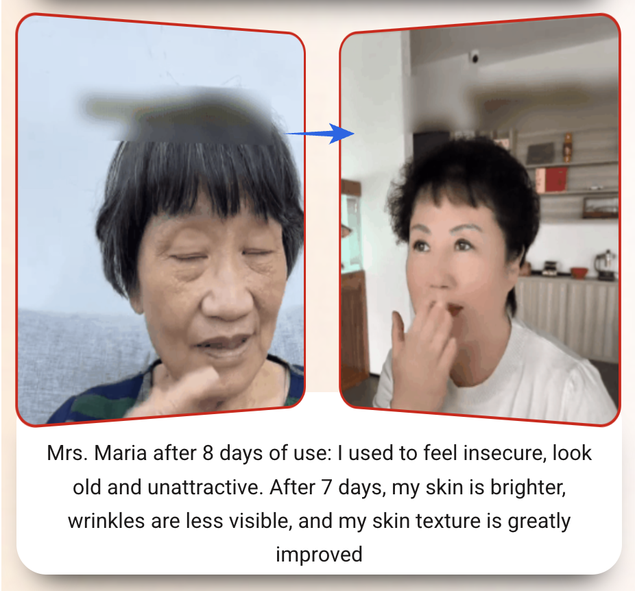 Laureen is a 58-year-old woman with skin aging issues (face lines, age spots, and forehead wrinkles). She's already tried countless beauty products that "promise" to deliver anti-aging benefits but saw no visible improvements. Her friend has recommended trying Palmitoyl Peptide Reversal Serum!